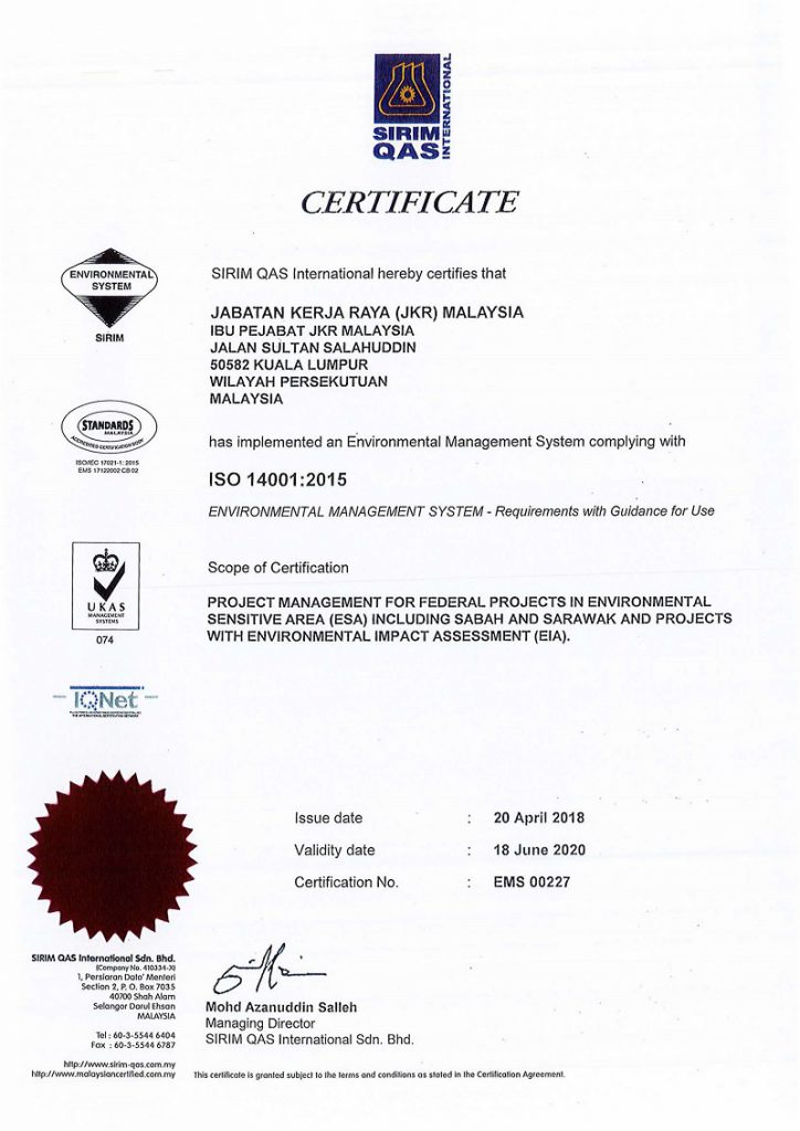 Anugerah Sirim QAS – ISO 9001: 2015 – Sistem Pengurusan Kualiti Anugerah Sirim QAS – ISO 14001: 2015 – Environmental Management System Anugerah Sirim QAS – OHSAS 18001: 2007 – Occupational Health Safety Management Systems Anugerah Sirim QAS - ISO 14001: 2015 - Environmental Management System