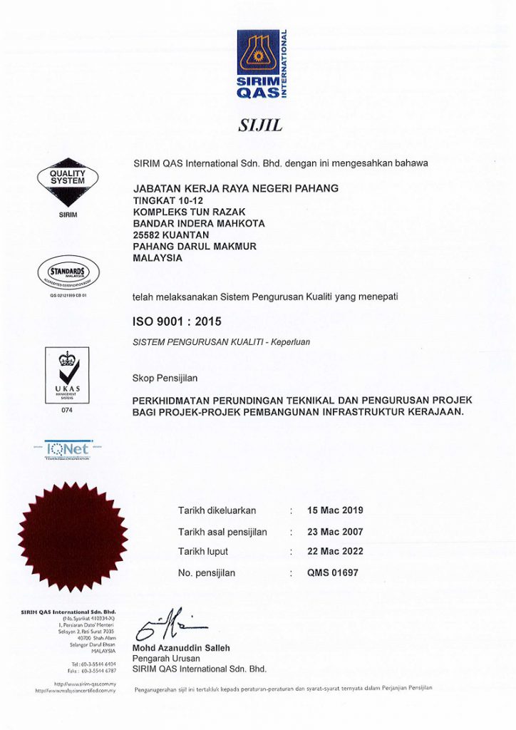 Anugerah Sirim QAS – ISO 9001: 2015 – Sistem Pengurusan Kualiti Anugerah Sirim QAS – ISO 14001: 2015 – Environmental Management System Anugerah Sirim QAS – OHSAS 18001: 2007 – Occupational Health Safety Management Systems Anugerah Sirim QAS - ISO 9001: 2015 - Sistem Pengurusan Kualiti
