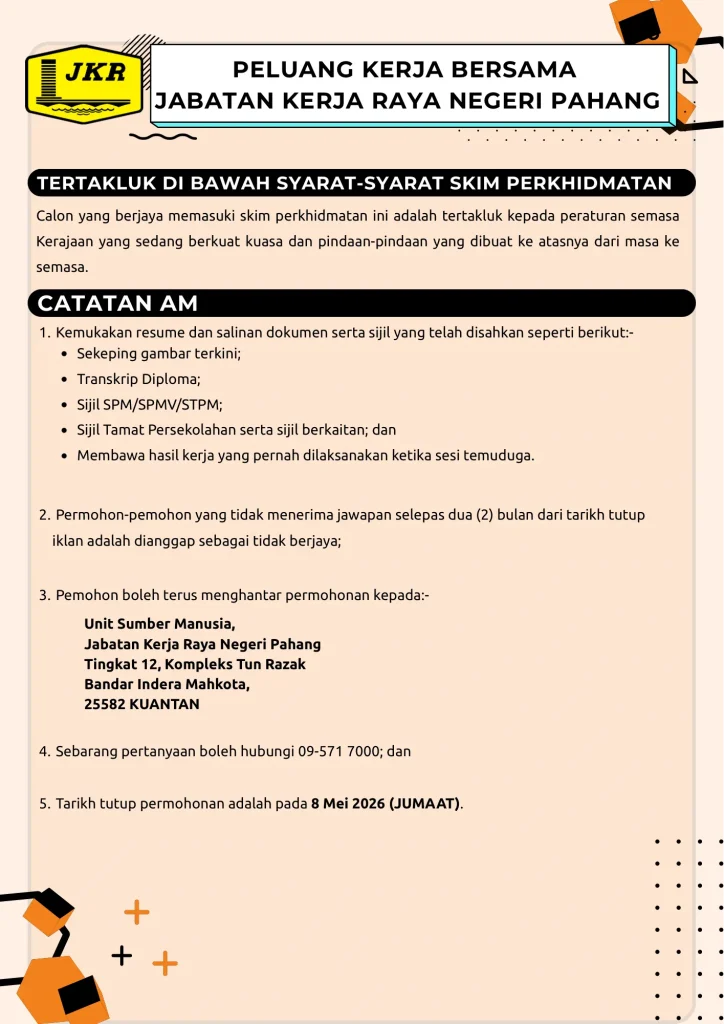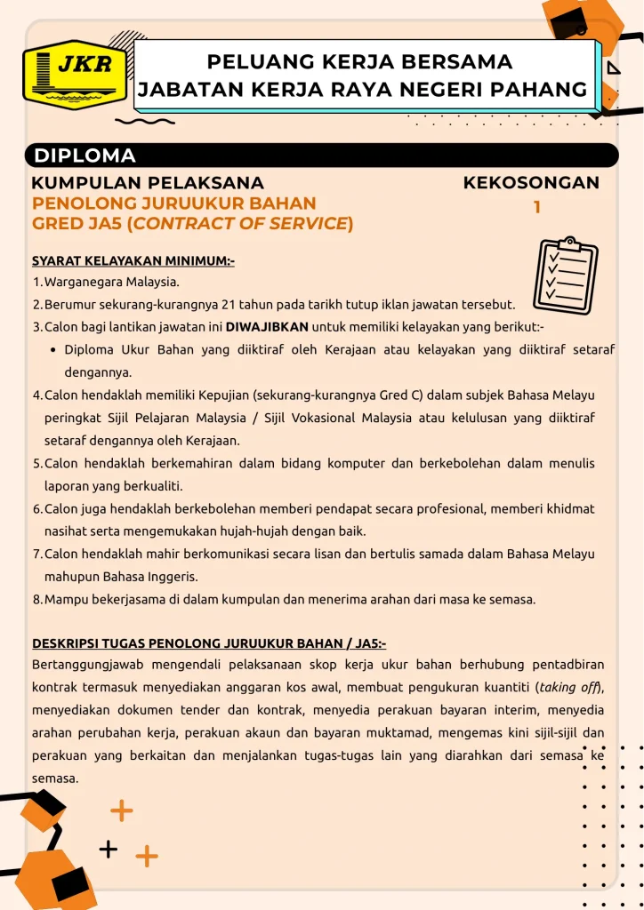 IKLAN JAWATAN KOSONG – CONTRACT OF SERVICE, Penolong Juruukur Bahan Gred JA5 di Jabatan Kerja Raya (JKR) Negeri Pahang Published On - 27/04/2026 korporat FrontPage Hebahan Muat Turun Iklan