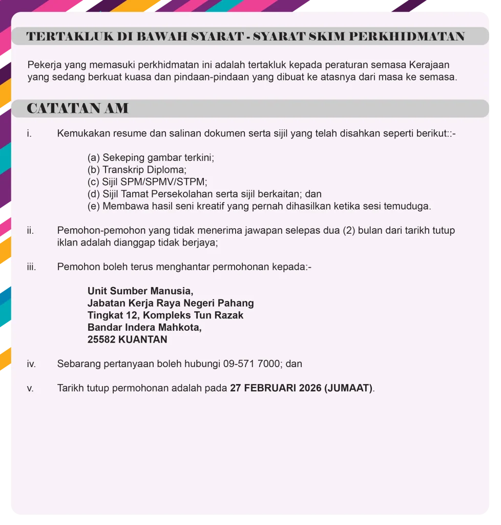 IKLAN JAWATAN KOSONG – MALAYSIA SHORT EMPLOYMENT PROGRAM (MySTEP), Penolong Pegawai Senibina Gred JA5 di JKR Negeri Pahang