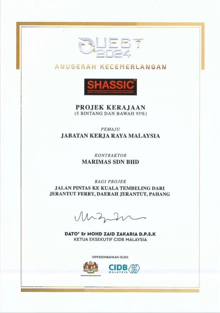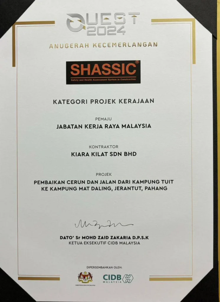 Penarafan ini merupakan satu pengiktirafan terhadap usaha dan komitmen JKR Daerah Jerantut bersama-sama kontraktor dalam memastikan pengurusan keselamatan dan kesihatan yang baik diamalkan di tapak pembinaan.