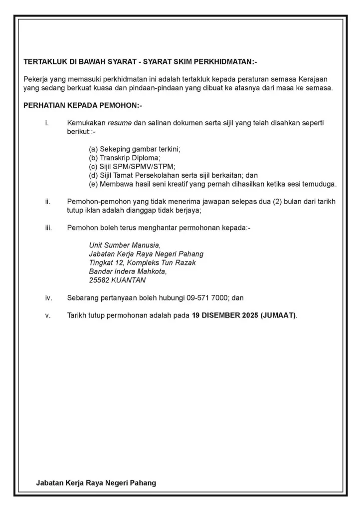 KEMASKINI : IKLAN JAWATAN KOSONG – MALAYSIA SHORT EMPLOYMENT PROGRAM (MySTEP), PENOLONG JURUTERA (AWAM) GRED JA5 Published On - 08/12/2025 korporat Arkib Hebahan Muat Turun Iklan