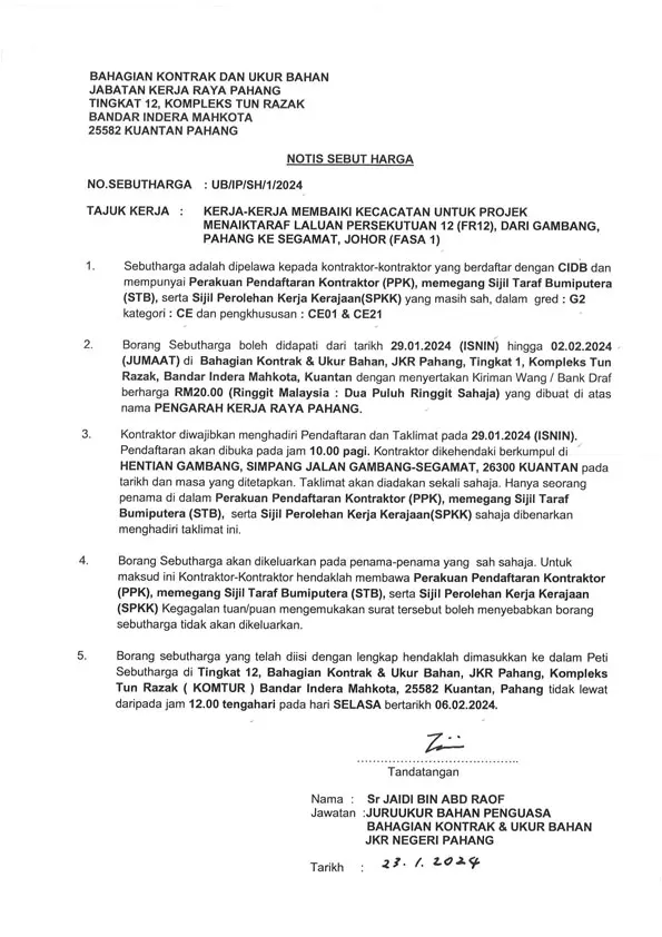 KERJA-KERJA MEMBAIKI KECACATAN UNTUK PROJEK MENAIKTARAF LALUAN PERSEKUTUAN 12(FR12), DARI GAMBANG, PAHANG KE SEGAMAT, JOHOR (FASA 1)