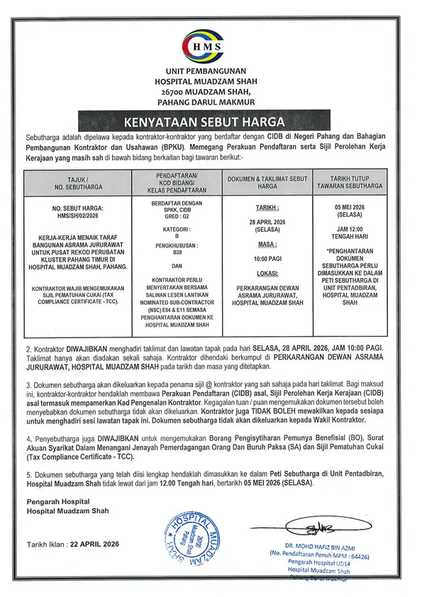 HomeAktivitiSebuthargaFrontPage SebuthargaKERJA-KERJA MENAIK TARAF BANGUNAN ASRAMA JURURAWAT UNTUK PUSAT REKOD PERUBATAN KLUSTER PAHANG TIMUR DI HOSPITAL MUADZAM SHAH, PAHANG