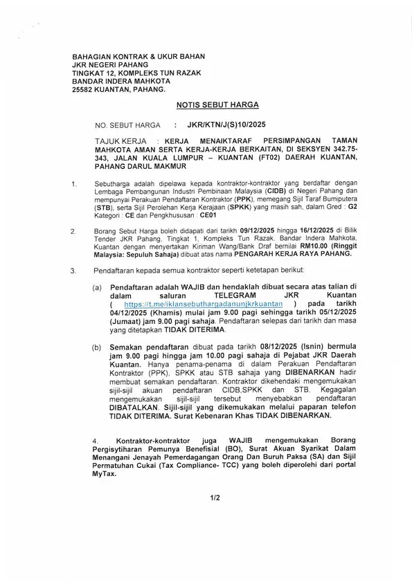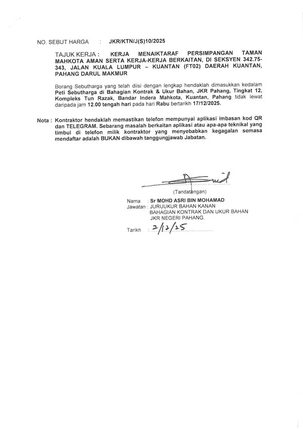 KERJA-KERJA MENAIKTARAF PERSIMPANGAN TAMAN MAHKOTA AMAN SERTA KERJA-KERJA BERKAITAN DI SEKSYEN 342.75 – 343, JALAN KUALA LUMPUR – KUANTAN (FT02) DAERAH KUANTAN, PAHANG DARUL MAKMUR