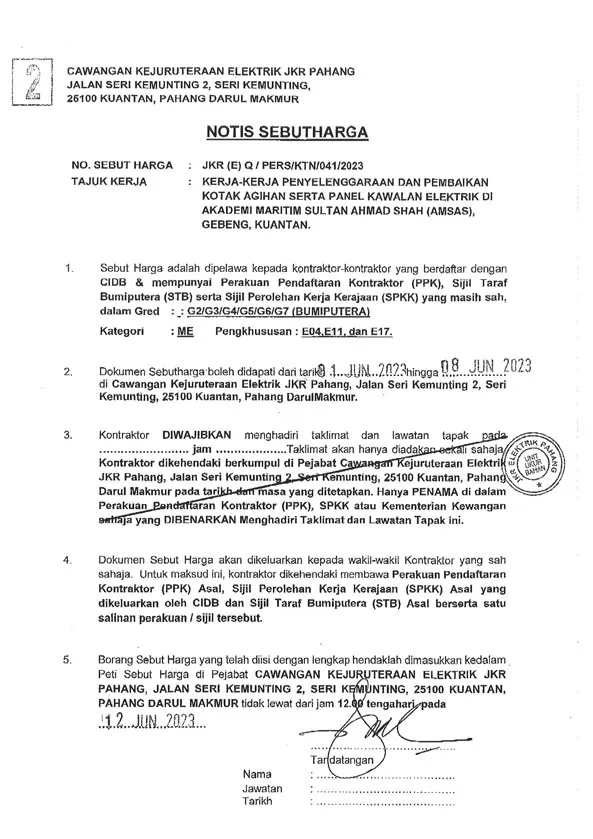 KERJA-KERJA PENYELENGGARAAN DAN PEMBAIKAN KOTAK AGIHAN SERTA PANEL KAWALAN ELEKTRIK DI AKADEMI MARITIM SULTAN AHMAD (AMSAS), GEBENG, KUANTAN