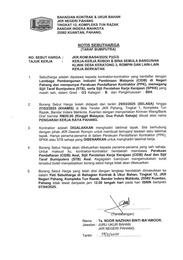 Home Aktiviti Sebutharga Arkib Sebutharga KERJA-KERJA ROBOH & BINA SEMULA BANGUNAN KLINIK DESA KERATONG 3, ROMPIN DAN LAIN-LAIN KERJA BERKAITAN