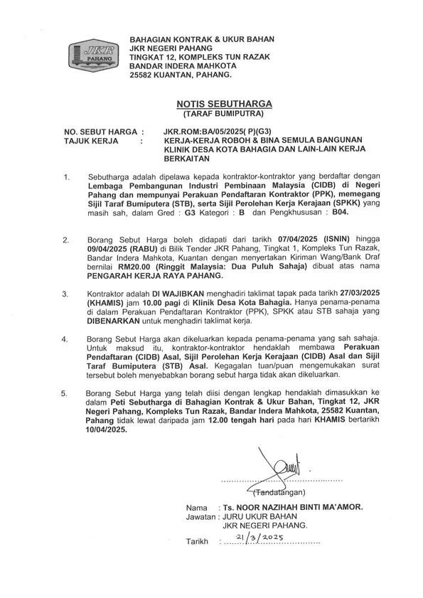 KERJA-KERJA ROBOH & BINA SEMULA BANGUNAN KLINIK DESA KOTA BAHAGIA DAN LAIN-LAIN KERJA BERKAITAN Published On - 21/03/2025 korporat Arkib Sebutharga