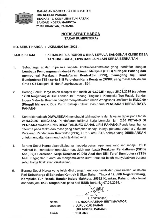 Home Aktiviti Sebutharga Arkib Sebutharga KERJA-KERJA ROBOH & BINA SEMULA BANGUNAN KLINIK DESA TANJUNG GAHAI, LIPIS DAN LAIN-LAIN KERJA BERKAITAN