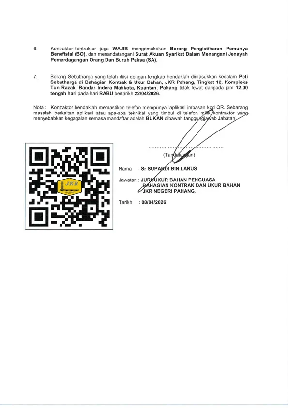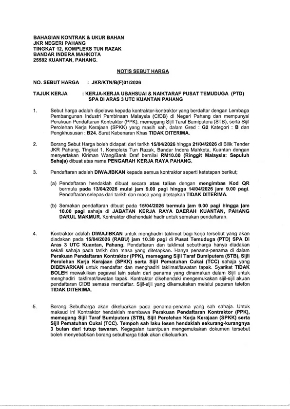 KERJA-KERJA UBAHSUAI & NAIKTARAF PUSAT TEMUDUGA (PTD) SPA DI ARAS 3 UTC KUANTAN PAHANG Published On - 09/04/2026 korporat FrontPage Sebutharga