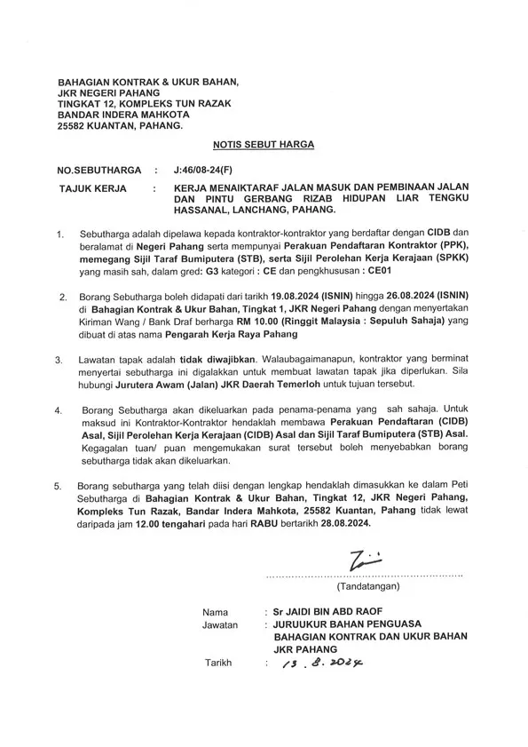 HomeAktivitiSebuthargaArkib SebuthargaKERJA MENAIKTARAF JALAN MASUK DAN PEMBINAAN JALAN DAN PINTU GERBANG RIZAB HIDUPAN LIAR TENGKU HASSANAL, LANCHANG, PAHANG