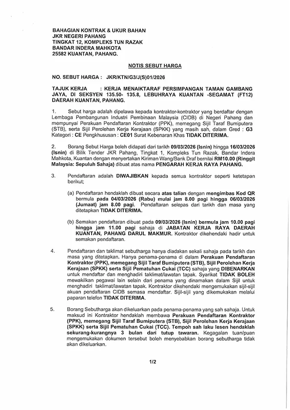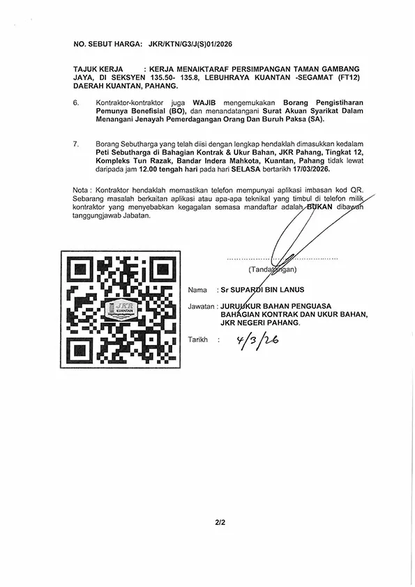 KERJA MENAIKTARAF PERSIMPANGAN TAMAN GAMBANG JAYA, DI SEKSYEN 135.50 – 135.80, LEBUHRAYA KUANTAN – SEGAMAT (FT12) DAERAH KUANTAN, PAHANG Published On - 04/03/2026 korporat FrontPage Sebutharga