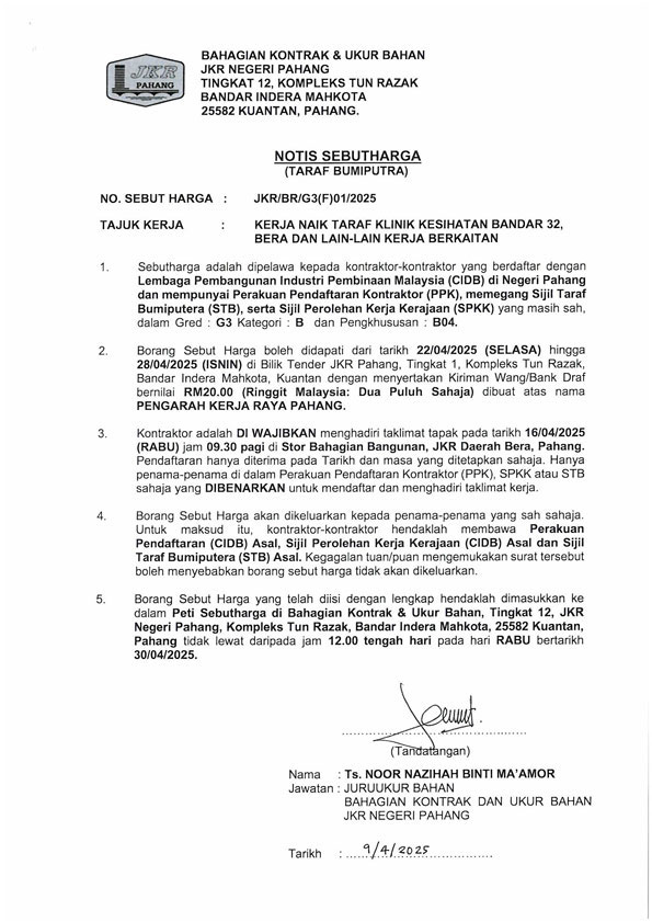 KERJA NAIK TARAF KLINIK KESIHATAN BANDAR 32, BERA DAN LAIN-LAIN KERJA BERKAITAN Published On - 09/04/2025 korporat Arkib Sebutharga
