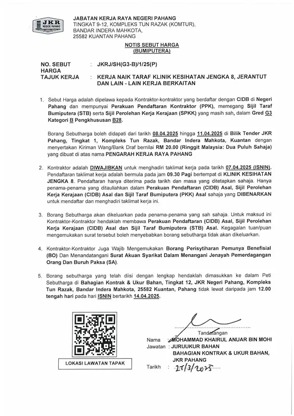 Home Aktiviti Sebutharga Arkib Sebutharga KERJA NAIK TARAF KLINIK KESIHATAN JENGKA 8, JERANTUT DAN LAIN-LAIN KERJA BERKAITAN