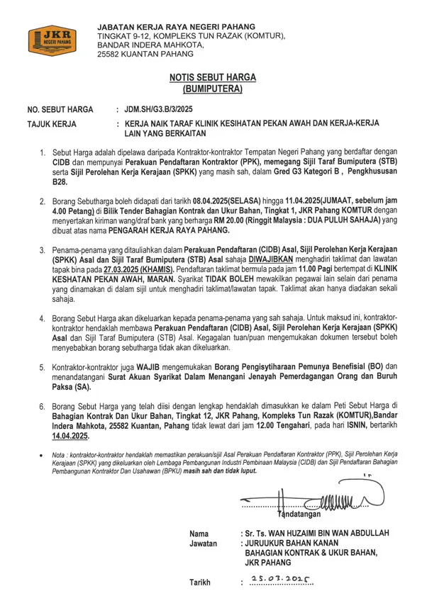 KERJA NAIK TARAF KLINIK KESIHATAN PEKAN AWAH DAN KERJA-KERJA LAIN YANG BERKAITAN Published On - 25/03/2025 korporat Arkib Sebutharga