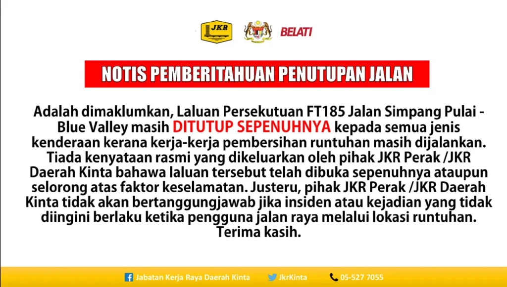 LALUAN PERSEKUTUAN FT185 JALAN SIMPANG PULAI – BLUE VALLEY MASIH DITUTUP SEPENUHNYA KEPADA SEMUA JENIS KENDERAAN Published On - 24/11/2024 korporat Arkib Hebahan