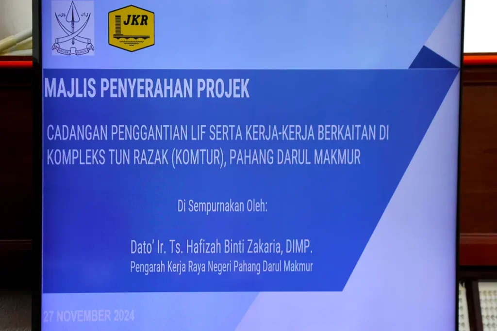 Majlis penyerahan projek siap bagi Cadangan Penggantian Lif Serta Kerja-kerja Berkaitan di Kompleks Tun Razak (KOMTUR) telah diadakan pada 27 November 2024 (Rabu), jam pada 09.00 pagi, bertempat di bilik Mesyuarat Anggerik Tingkat 13, Kompleks Tun Razak (KOMTUR), Bandar Indera Mahkota, Kuantan, Pahang.