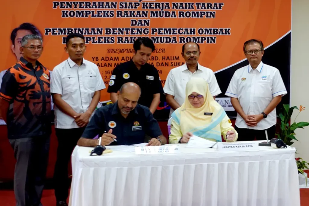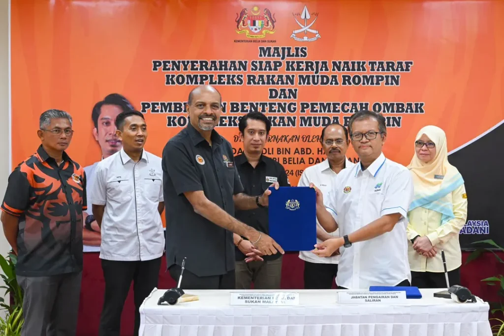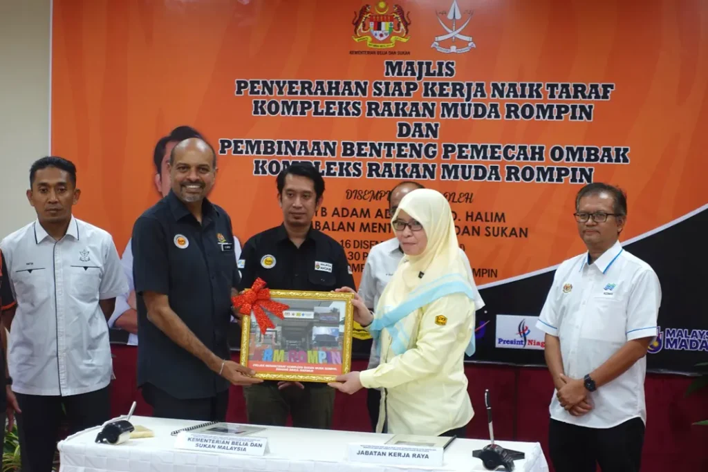 Isnin, 16 Disember 2024 – Telah berlangsungnya Majlis Penyerahan Projek Menaiktaraf Kompleks Rakan Muda Sukan Air Rompin, Pahang Darul Makmur. Majlis telah disempurnakan oleh YB. Tuan Adam Adli bin Abdul Halim (Timbalan Menteri Belia dan Sukan Malaysia). Turut hadir menyempurnakan majlis adalah YB. Dato’ Ir. Razali bin Kassim (EXCO Kerjaraya, Pengangkutan dan Kesihatan Negeri Pahang), YBrs. Ts. Dr. Nagulendran Kangayatkarasu (Ketua Setiausaha Kementerian Belia dan Sukan Malaysia), YBrs. Tuan Muhammad Hatta bin Kassim (Pegawai Daerah Rompin), YH. Dato’ Ir. Ts. Hafizah binti Zakaria (Pengarah Kerja Raya Negeri Pahang) dan YBrs. Ir. Ts. Mohd Faiz bin Mohd Faudzi (Jurutera Daerah, JKR Daerah Rompin).