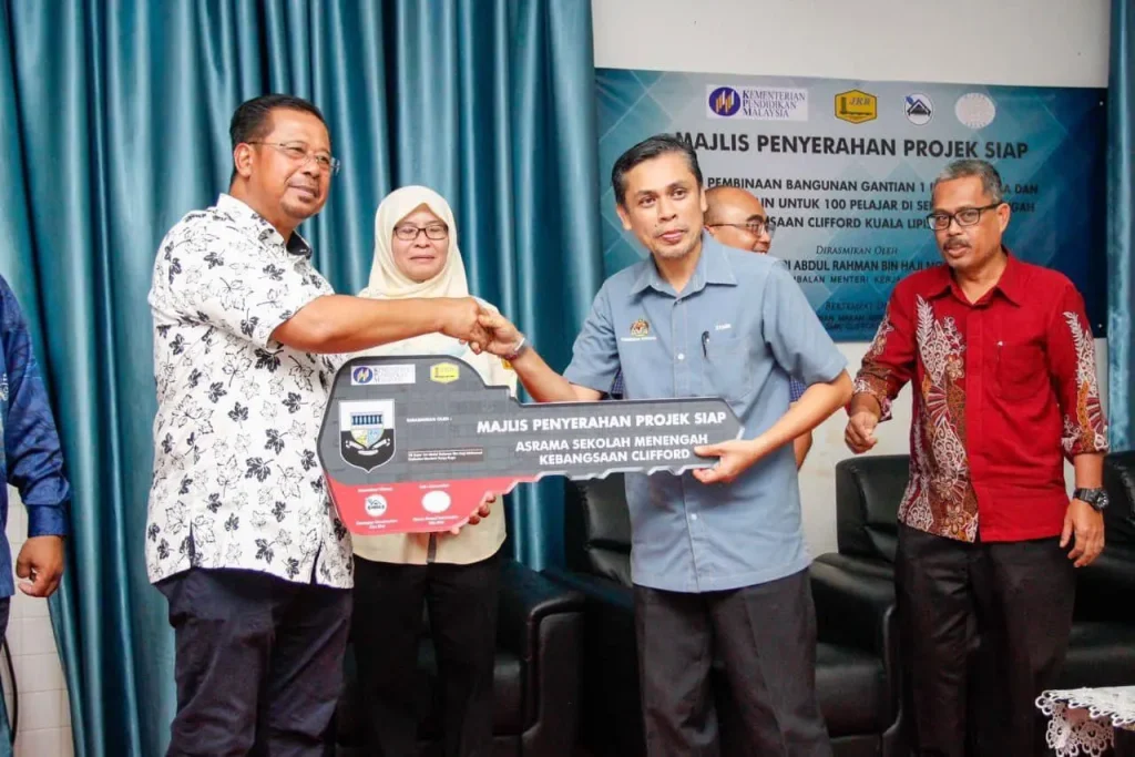 Kuala Lipis, 28 Oktober 2023 – Majlis Penyerahan Projek Siap kepada pelanggan (Jabatan Pendidikan Pahang) bagi Projek Pembinaan Bangunan Gantian 1 Blok Asrama & Kemudahan Lain untuk untuk 100 Pelajar di SMK Clifford Kuala Lipis, Pahang Darul Makmur telah diadakan pada 28 Oktober 2023 yang lalu.