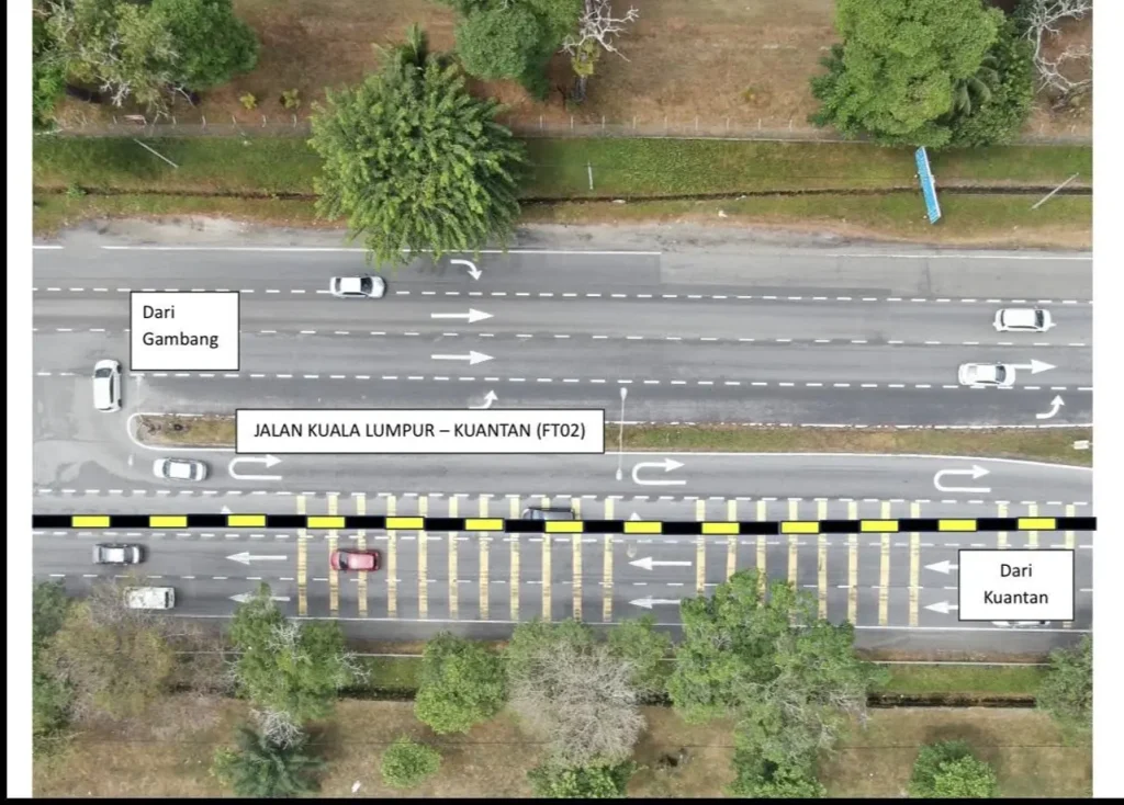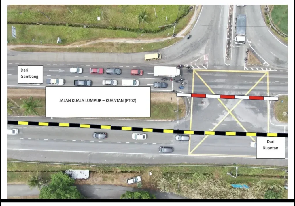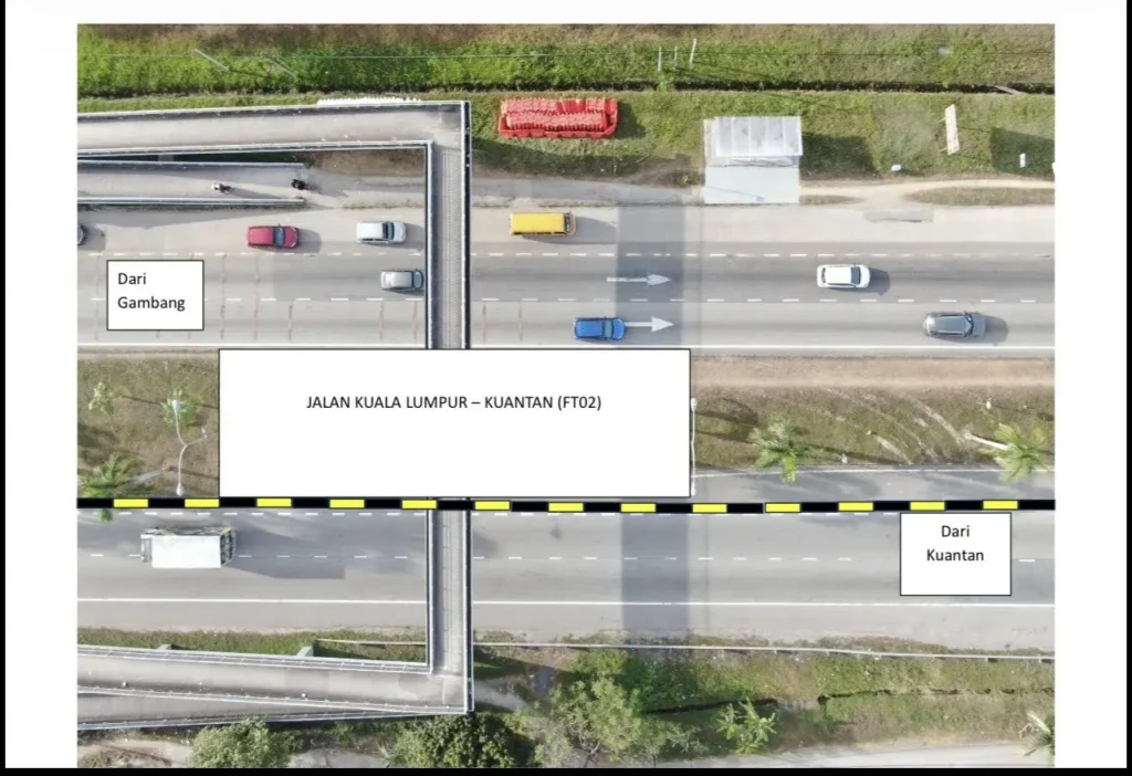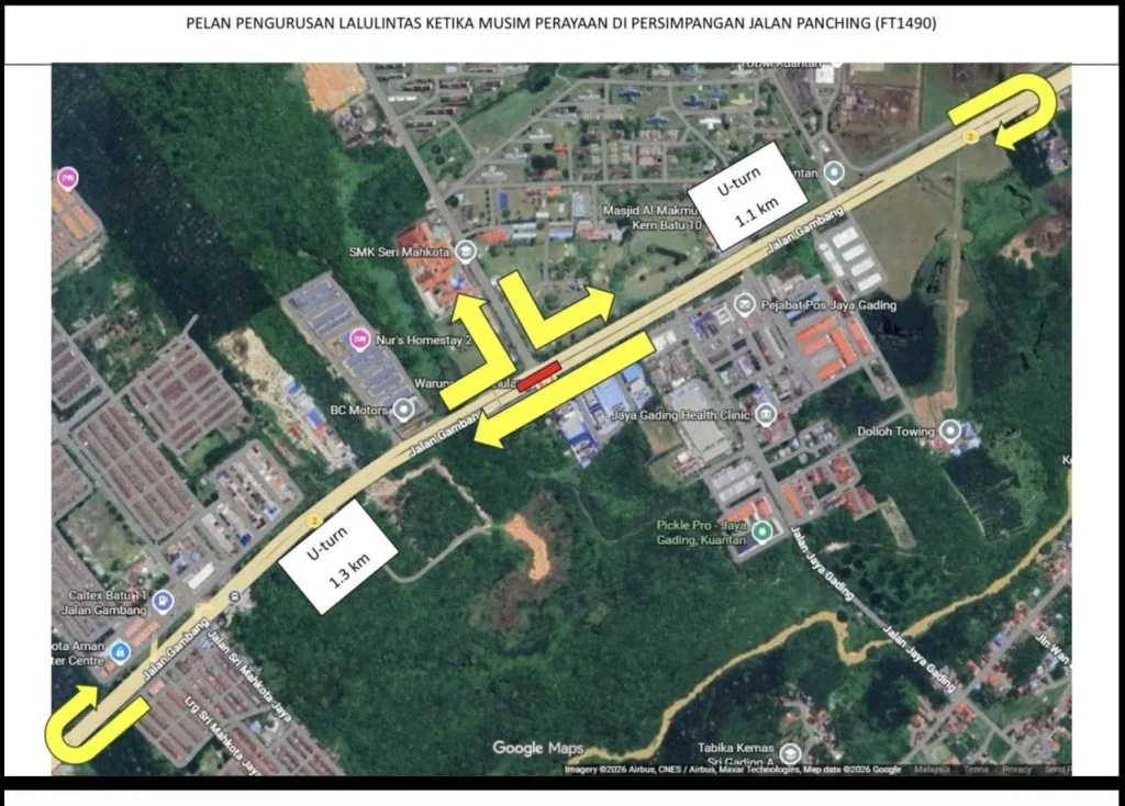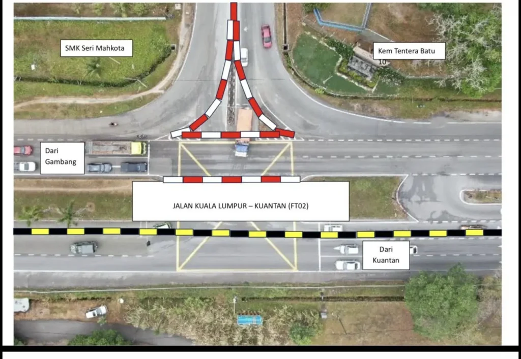 Dengan ini dimaklumkan bahawa Pasukan Projek Membina Persimpangan Bertingkat Panching, Jalan Kuala Lumpur – Kuantan (FT02)akan membuat penutupan sementara Lampu Isyarat di Persimpangan Jalan Kuantan – Kuala Lumpur (FT02) ke Sg. Panching Utara (FT1490) bagi melancarkan aliran trafik sempena cuti Hari Raya Aidilfitri 2026.