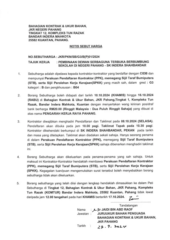 PEMBINAAN DEWAN SERBAGUNA TERBUKA BERBUMBUNG SEKOLAH DI NEGERI PAHANG – SK INDERA SHAHBANDAR Published On - 25/09/2024 korporat Arkib Sebutharga