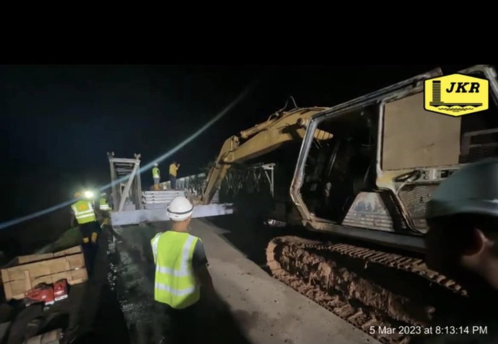Bagi penyelesaian segera (sementara), Jambatan Panel Keluli Bermodular (Jambatan Bailey) telah dibina dengan kerjasama pasukan Jambatan Bailey dari Jabatan Kerja Raya (JKR) Malaysia, JKR Daerah Temerloh, JKR Daerah Kuala Pilah, JKR Cawangan Kejuruteraan Mekanikal Negeri Pahang, JKR Cawangan Kejuruteraan Mekanikal Pahang Barat, JKR Mekanikal Negeri Sembilan, JKR Negeri Melaka, JKR Mekanikal Selangor dan Angkatan Tentera Malaysia (ATM) dari Skuadron Ke 11 Rejimen Askar Jurutera Mekanize dan Skuadron Ke 8 Rejimen Askar Jurutera DiRaja turut serta Agensi Pengurusan Bencana Negara, Jabatan Perdana Menteri (NADMA), Konsesi RoadCare Muadzam, Pengurusan Air Pahang (PAIP) Daerah Rompin dan Tenaga Nasional Berhad (TNB).