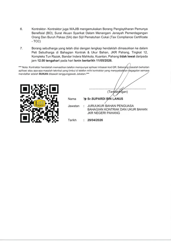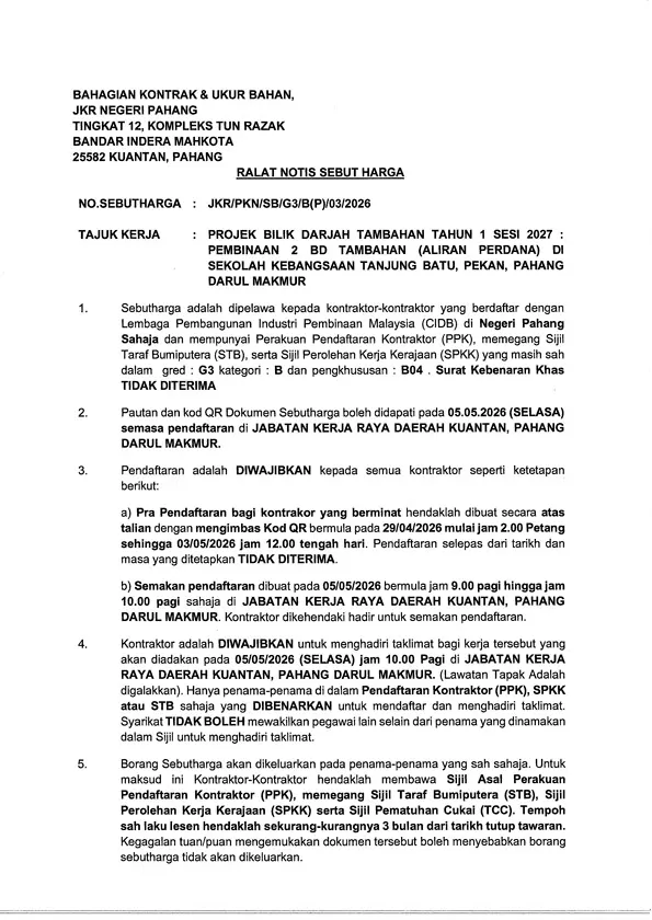 PROJEK BILIK DARJAH TAMBAHAN TAHUN 1 SESI 2027: PEMBINAAN 2 BD TAMBAHAN (ALIRAN PERDANA) DI SEKOLAH KEBANGSAAN TANJUNG BATU, PEKAN, PAHANG DARUL MAKMUR