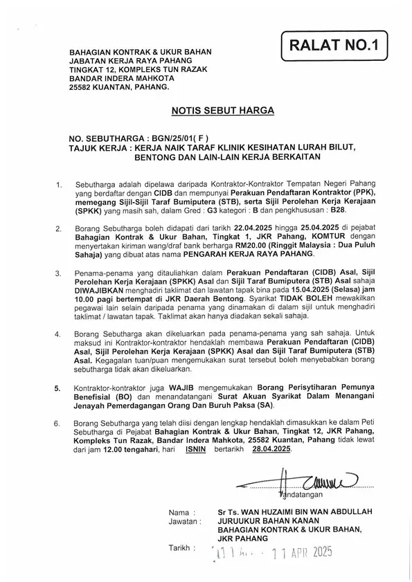 RALAT NO.1 – KERJA NAIK TARAF KLINIK KESIHATAN LURAH BILUT, BENTONG DAN LAIN-LAIN KERJA BERKAITAN Published On - 15/04/2025 korporat Arkib Sebutharga